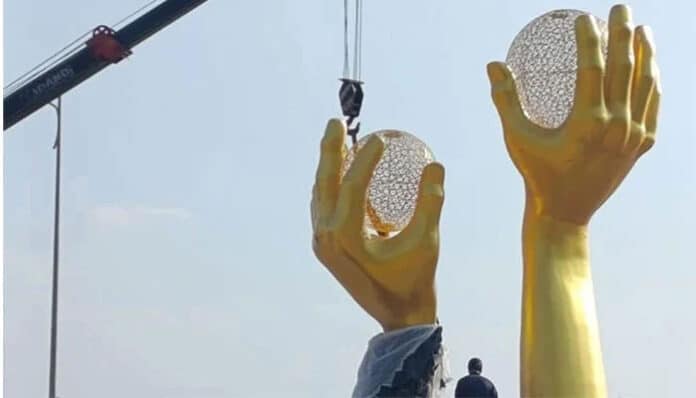 نجی ہاؤسنگ سوسائٹی کی جانب سے ہاتھوں میں گلوب کے 2 ماڈلز ایران ایونیو پر نصب کیے گئے تھے۔