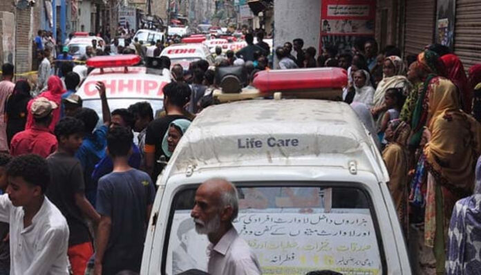 پولیس کے مطابق واقعہ لیاری کے علاقے کھڈا مارکیٹ میں پیش آیا جہاں عمارت کے چھٹے فلور کی چھت نیچے آگری۔